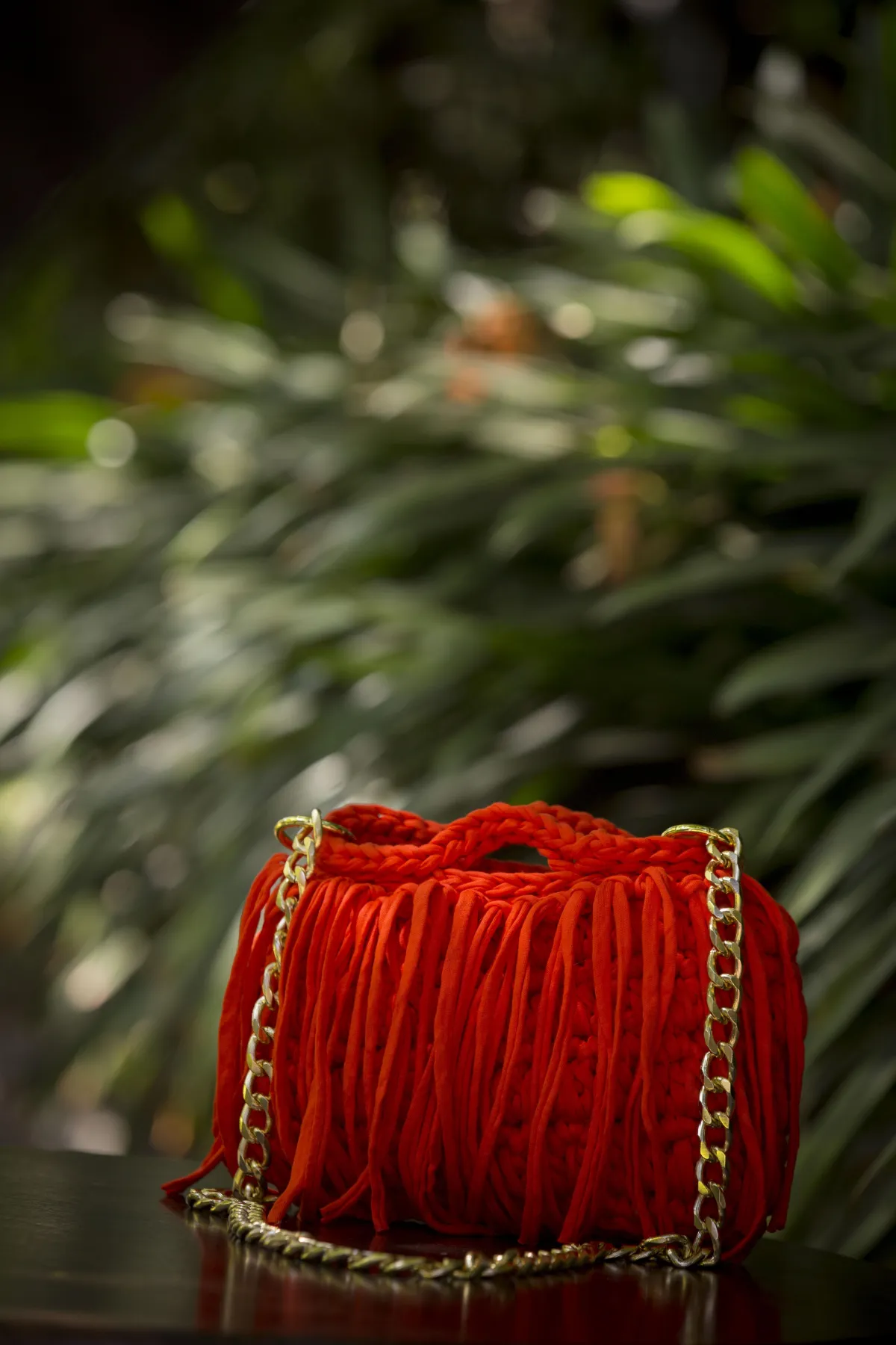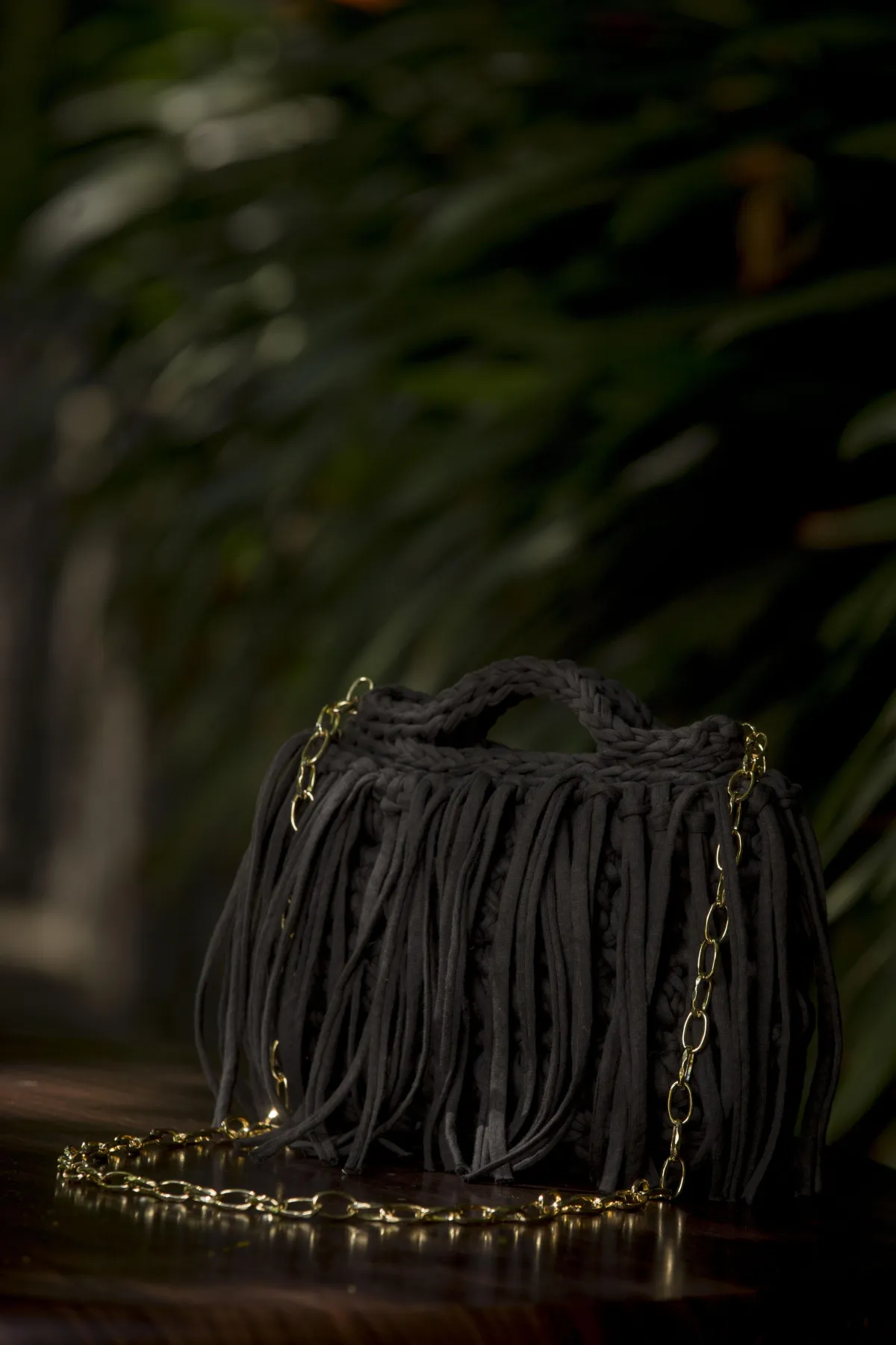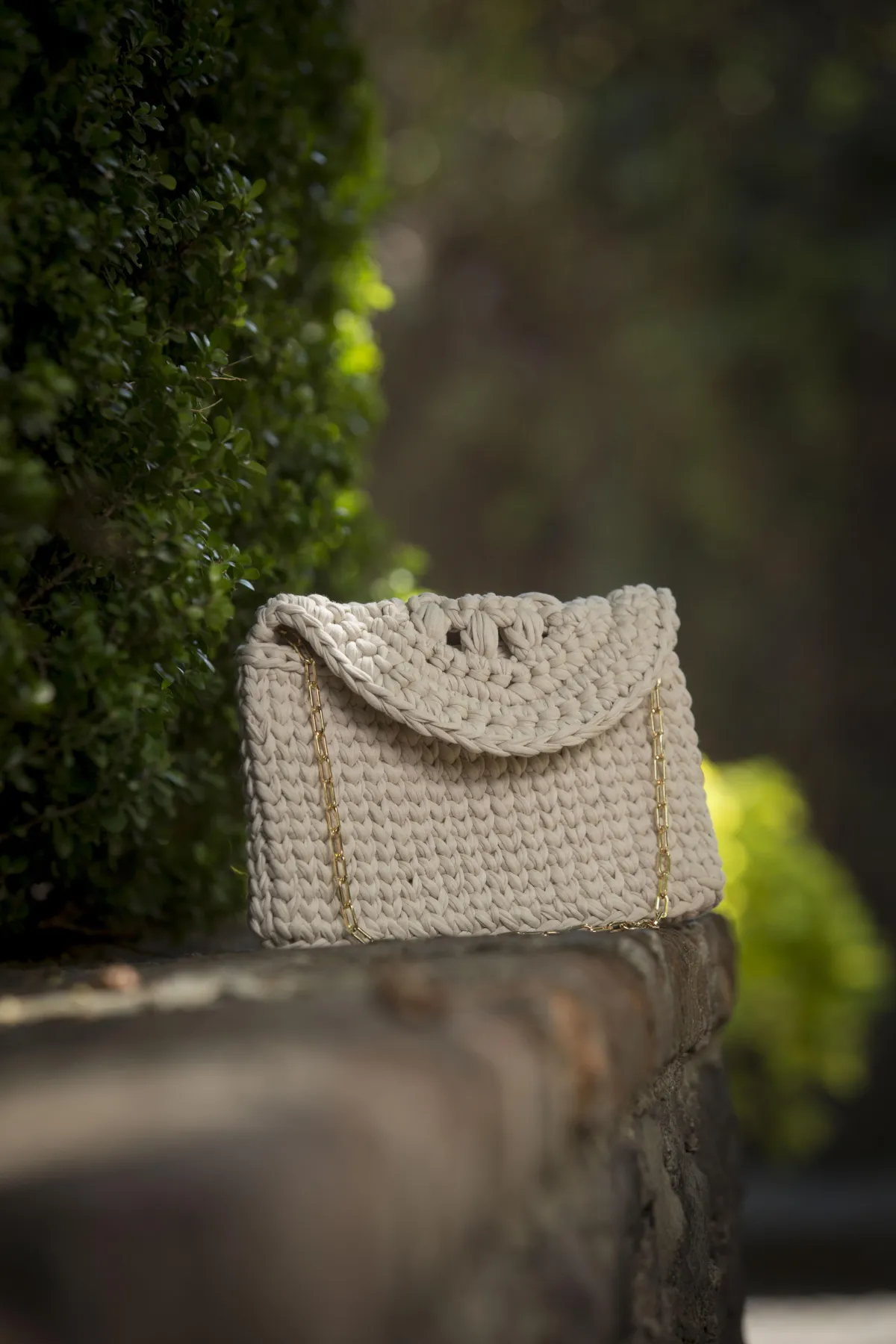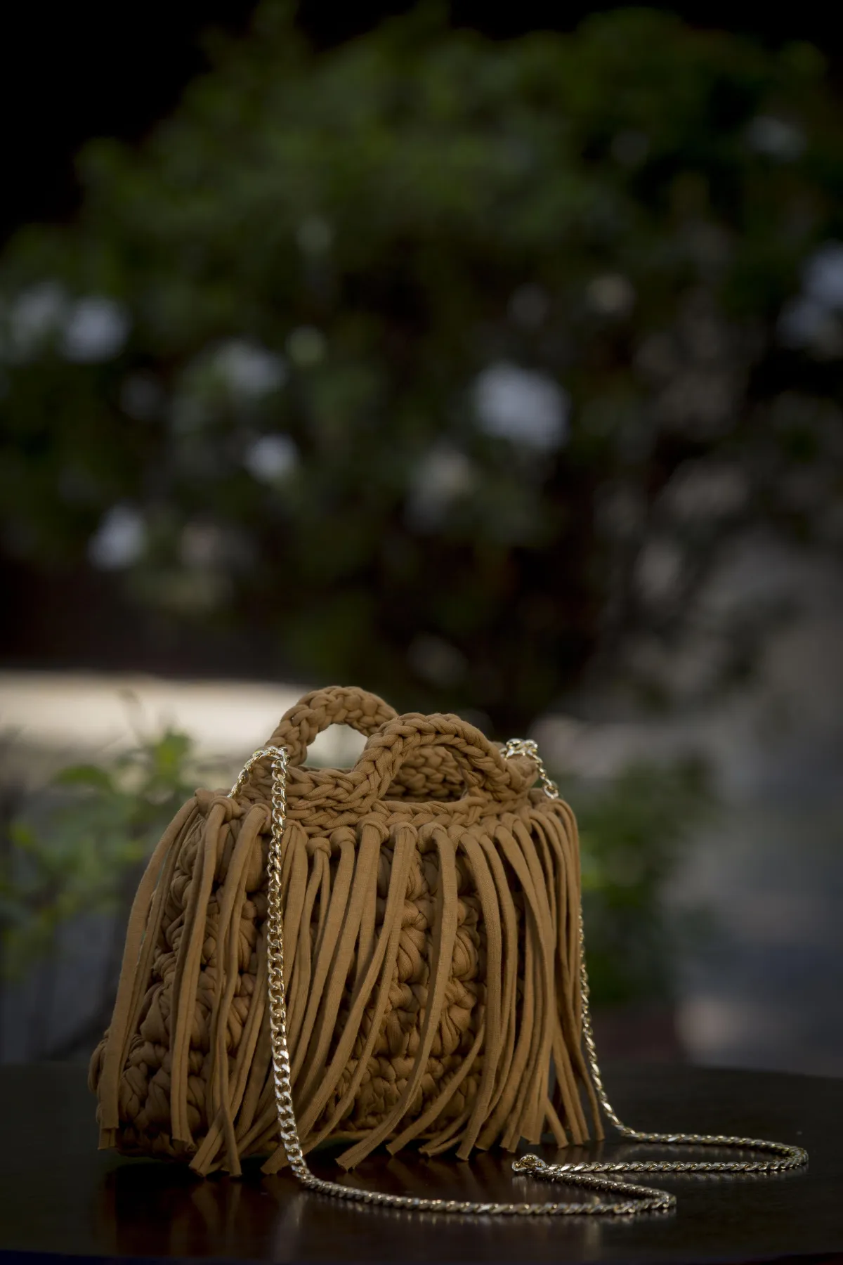 Bolsa tejida a mano con trapillo de alta calidad y detalles en cadena de chapa de oro